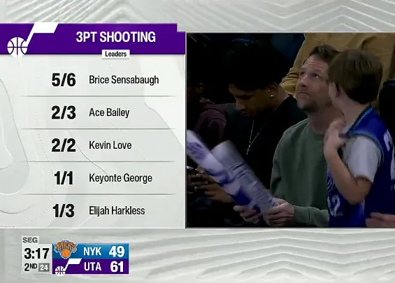 第二节比赛中,爵士全队三分18中14高达78%,次节61-49打停尼克斯。